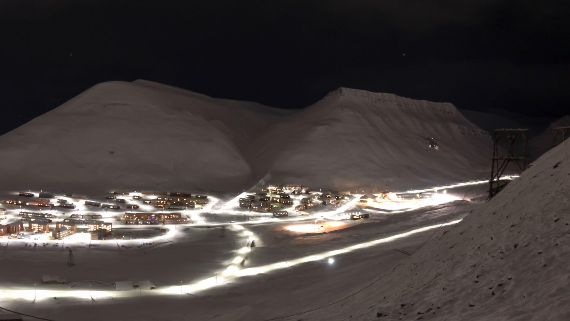 Even without sunrise, the town sees faint twilight along the southern horizon and sometimes the green curtains of the Aurora Borealis provide intermittent illumination.