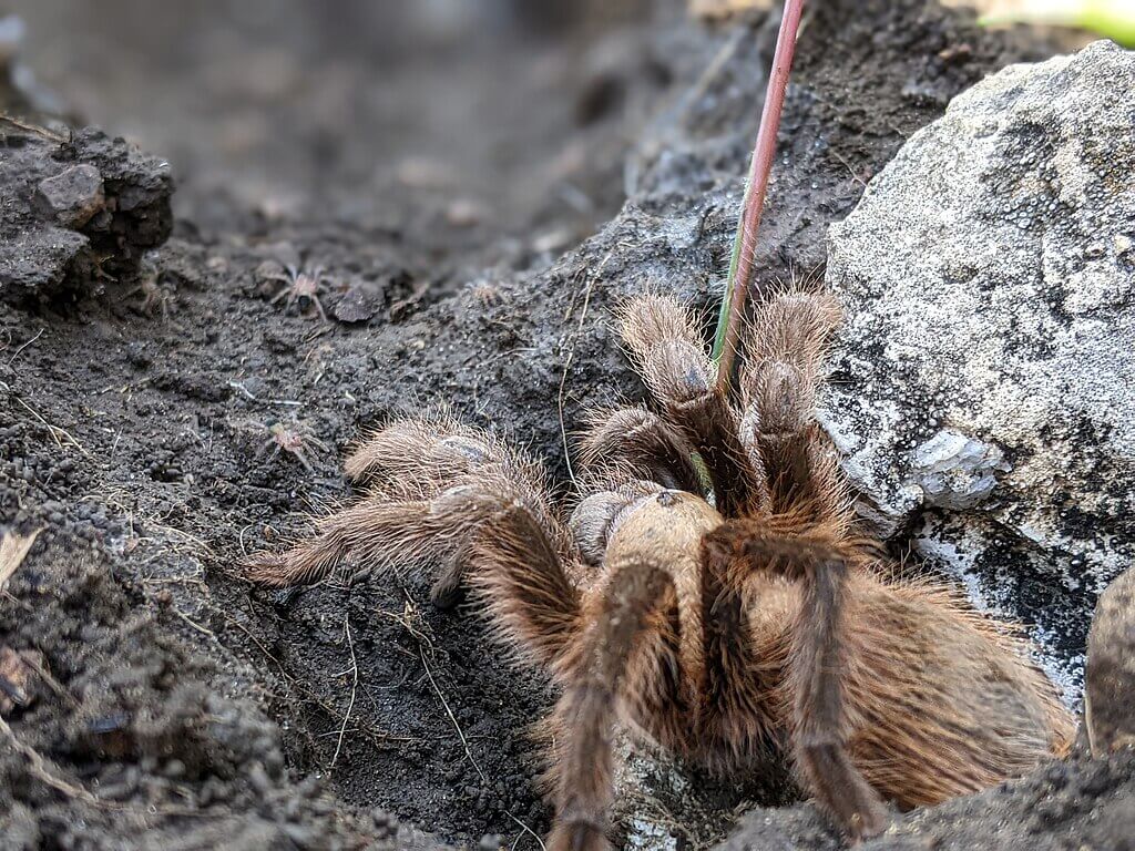 For most of their lives, Texas brown tarantulas remain out of sight. They live inside underground burrows dug beneath rocks or logs, using silk to line the walls and detect vibrations from passing prey. These spiders typically emerge only at night to hunt insects and other small animals before retreating back underground.