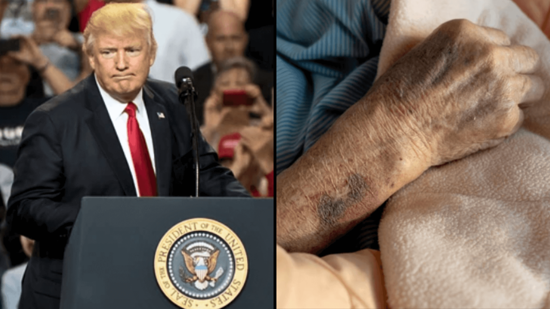 Donald Trump speaking at a podium with the presidential seal; close-up of a bruised arm resting on fabric.