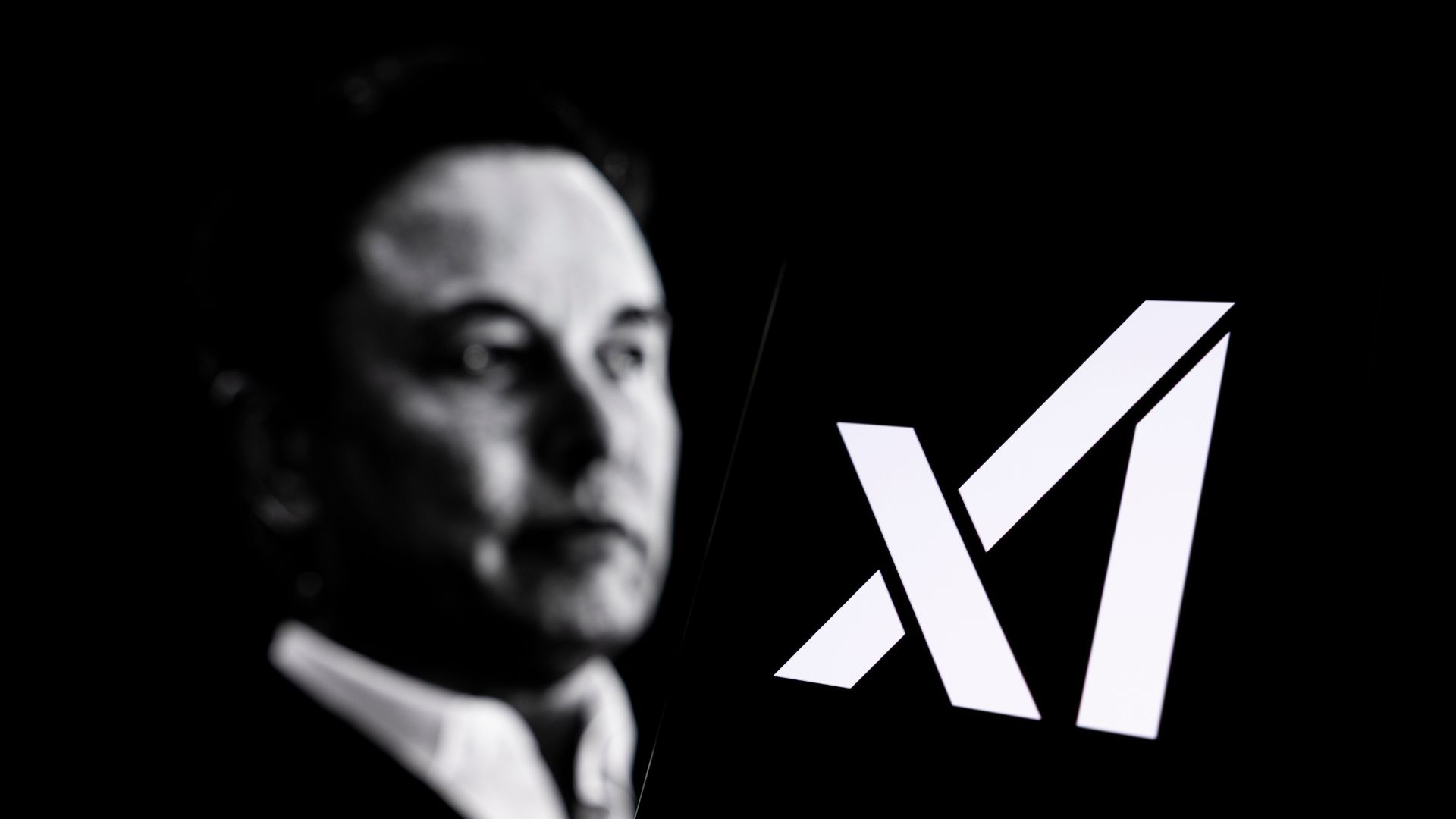The logo of xAI, Elon Musk's artificial intelligence company, is displayed on a smartphone screen. A portrait of Elon Musk is visible in the background.