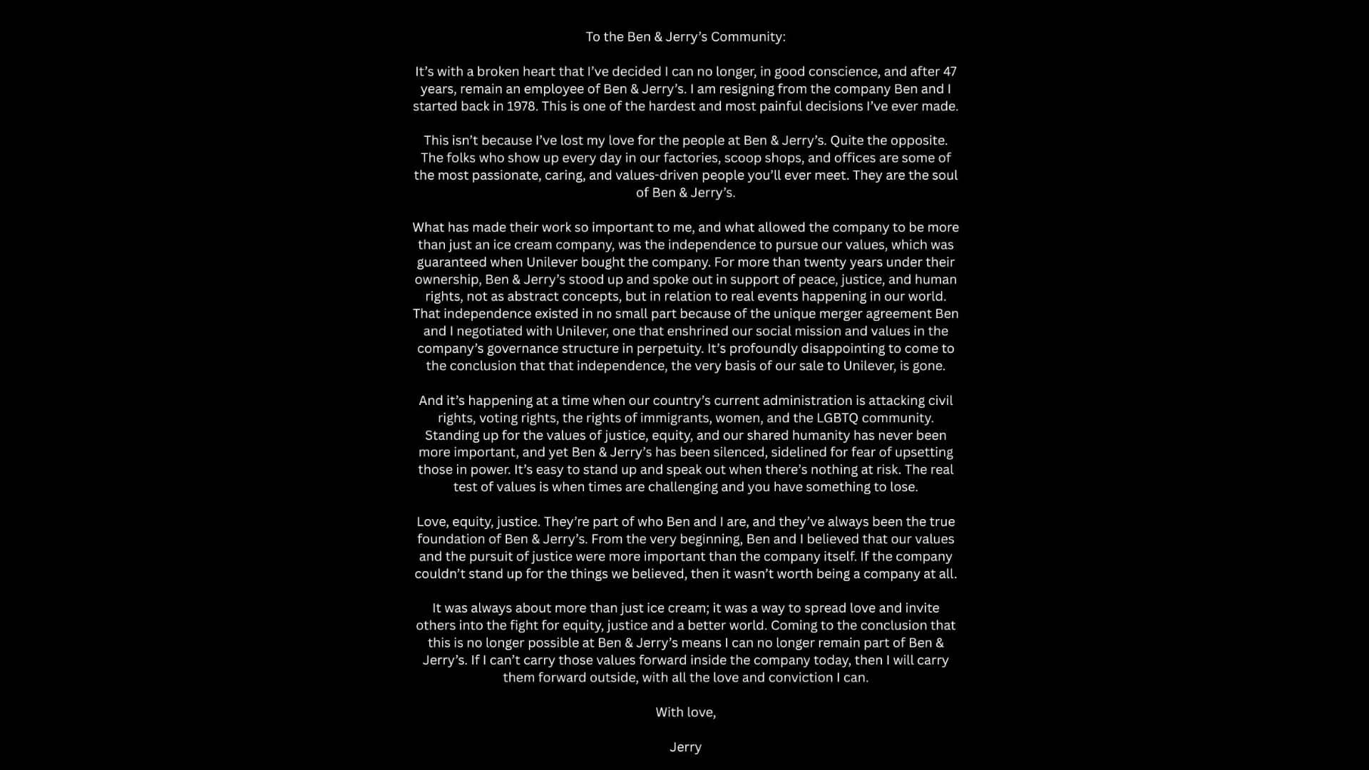 Jerry said goodbye to the brand in his letter with some encouraging, if not haunting, final words: “Standing up for the values of justice, equity, and our shared humanity has never been more important, and yet Ben & Jerry’s has been silenced, sidelined for fear of upsetting those in power.”